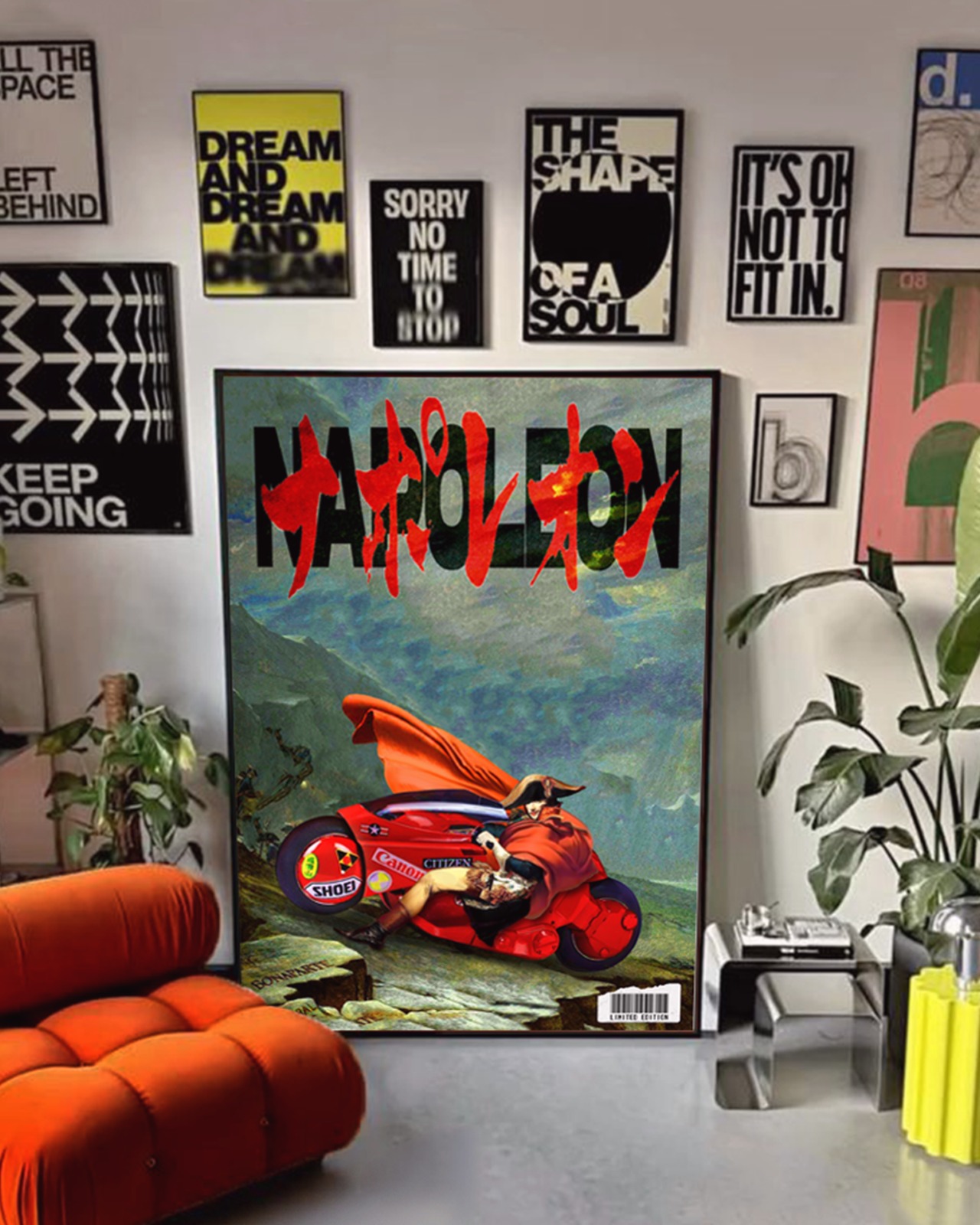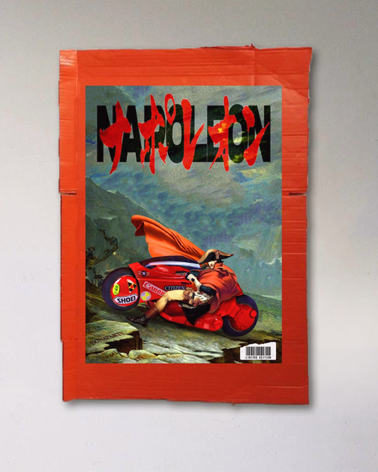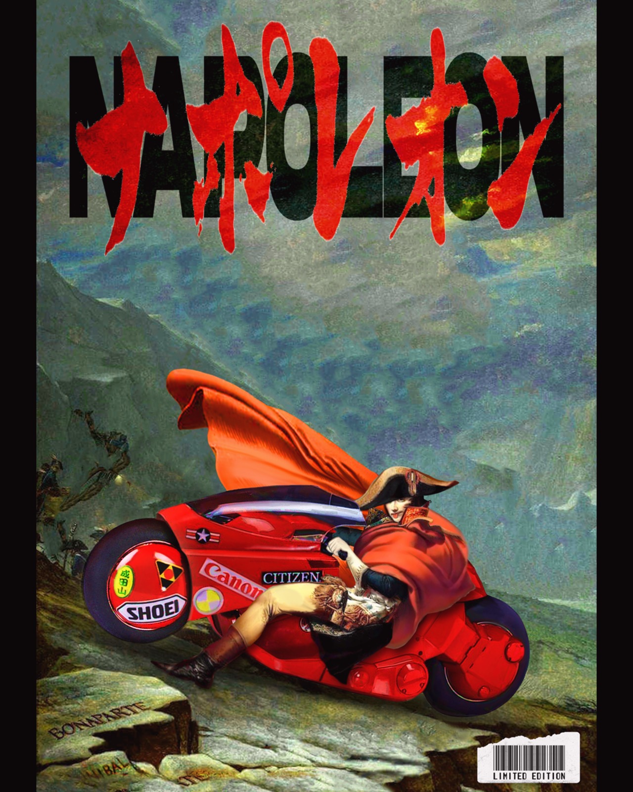伝統的な「ナポレオンのアルプス越え」(ダヴィッド作)をベースに、伝説のバイク“金田のバイク”(AKIRA)へとリミックス。