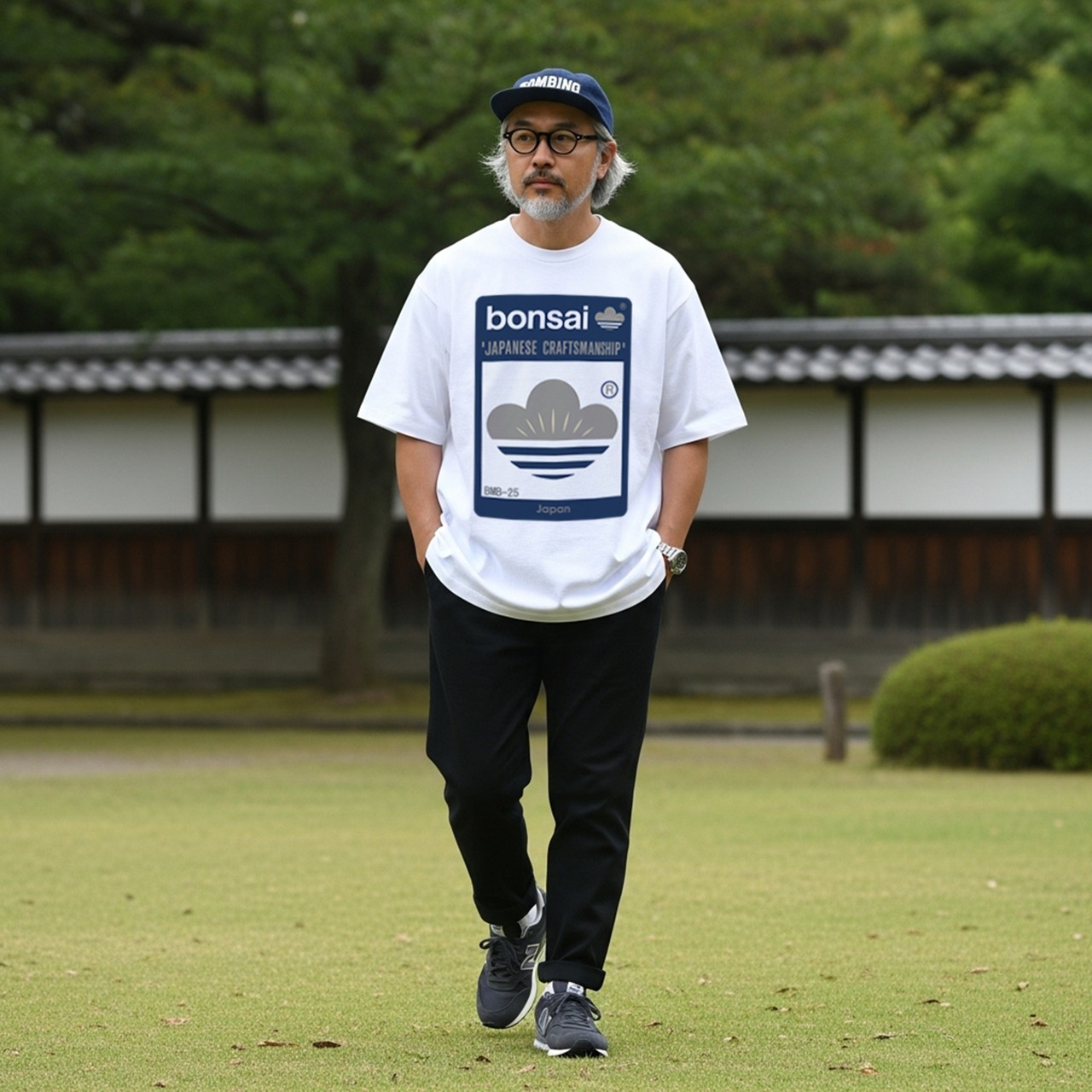 和モダン 盆栽ロゴ – ストリート デザイン  クラシックブルー 侘び ヘビーオンス ホワイトTシャツ 【 インクジェット 】