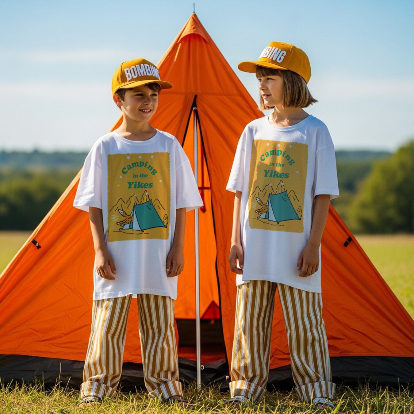Camping in the YIKES オレンジ ホワイトTシャツ 【 インクジェット 】