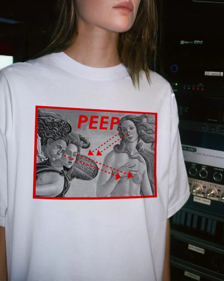 "PEEP SHOW"というユニークなデザインが目を引くTシャツです。