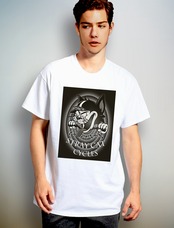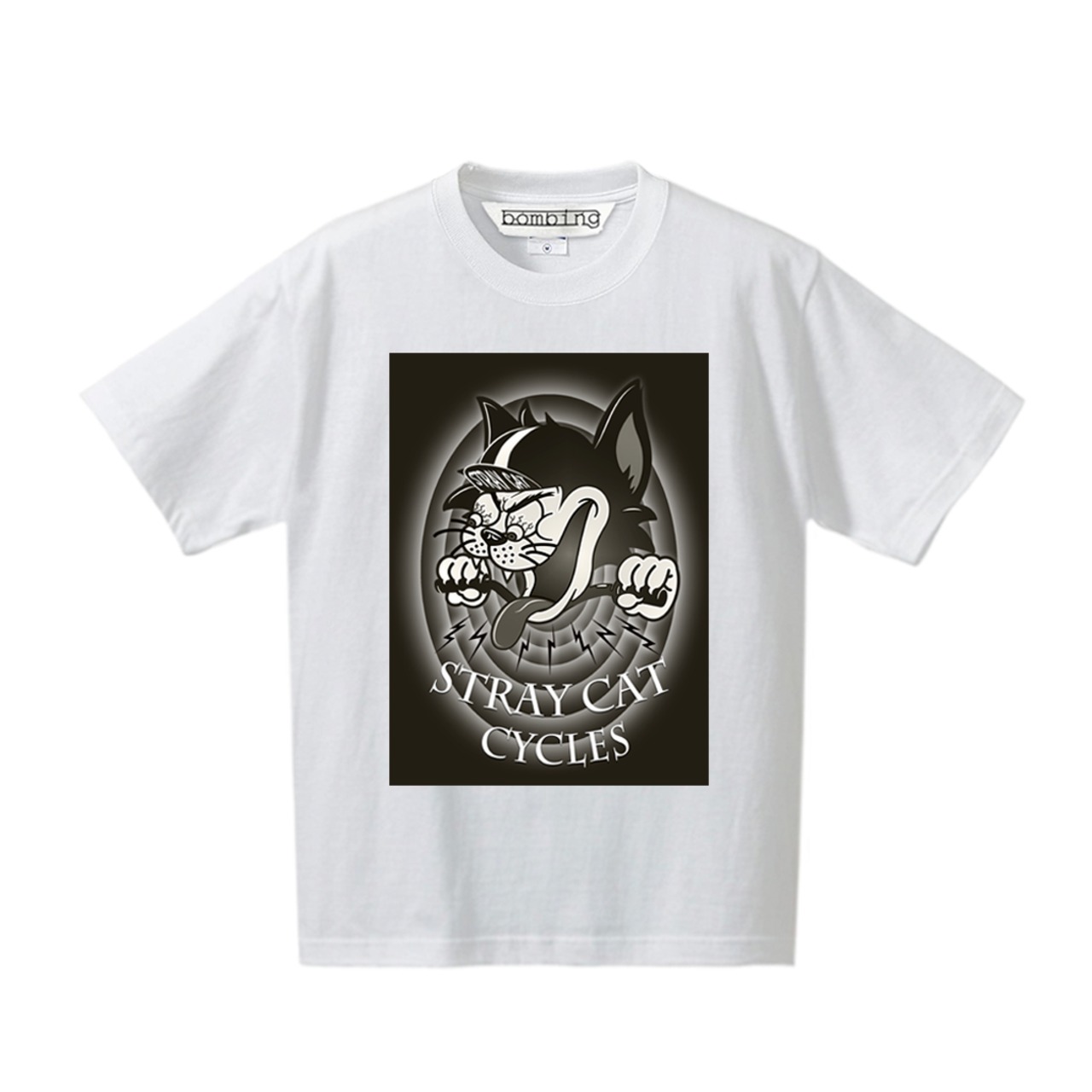 STRAY CAT CYCLES カートゥーン風レトロブラックデザイン ホワイト Tシャツ 【インクジェット】