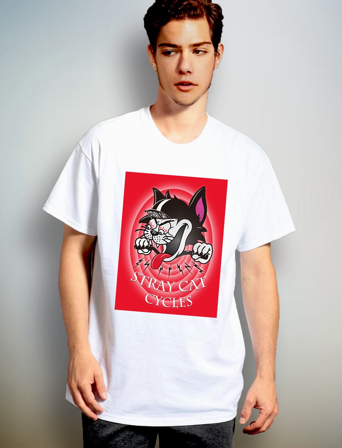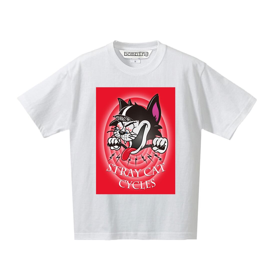 STRAY CAT CYCLES カートゥーン風レトロレッドデザイン ホワイトTシャツ 【インクジェット】
